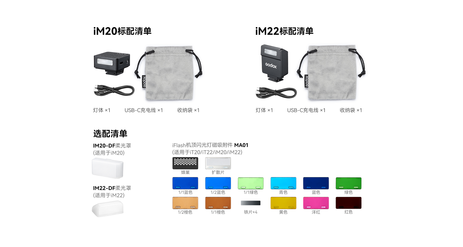 iM20/iM22以小巧轻便为核心,安装在相机上后可直接放入包中,避免频繁拆卸,轻松出行。内置锂电池,支持Type-C便携充电,随时充电,拍照不停。单触点设计,广泛兼容。五档功率调节,灵活应对不同光线环境。