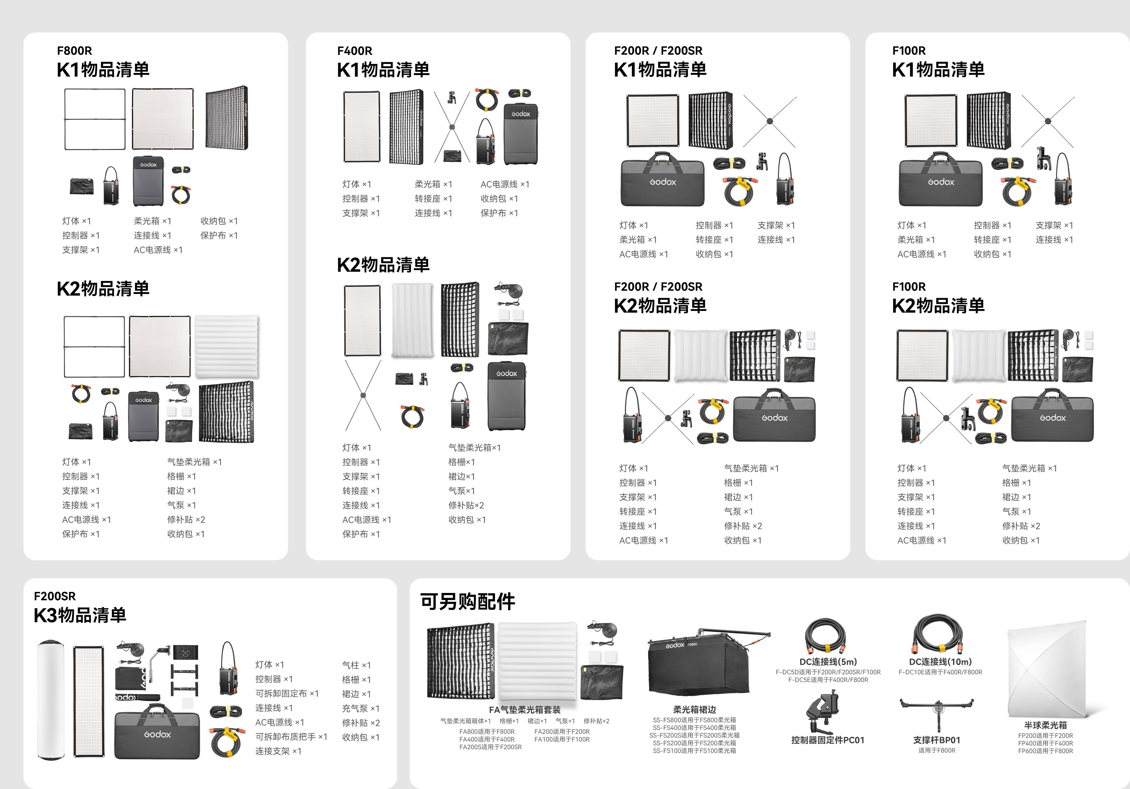 F全彩系列柔性布灯标配有柔光箱(带格栅),可通过魔术贴快速安装,实现软硬光自由切换;此外,还有柔光气垫、半球柔光箱(需另购)等附件可营造不同光效,控制光影,满足不同场景的布光需求。