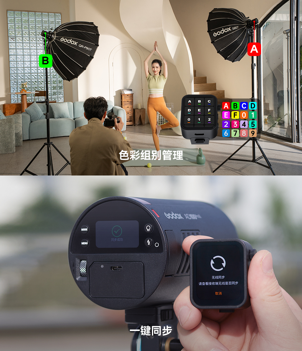 AD100Pro II机身新增组别识别灯,在多灯布光时可快速识别灯光设备所属组别,实现便捷调参、调节灯位等布光操作;同时配备无线同步功能,可一键匹配X3系列引闪器及具备此功能的神牛闪光灯,显著提升拍摄效率。
