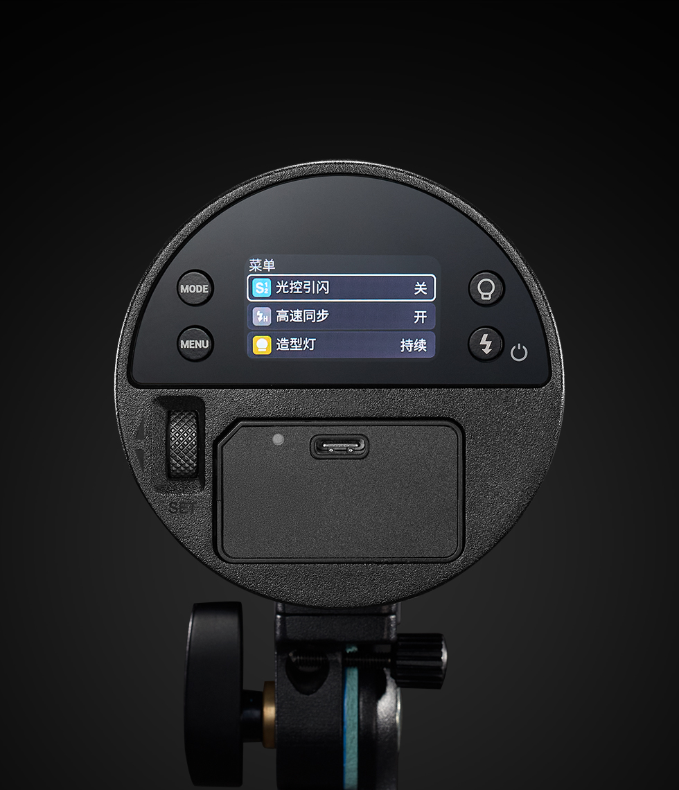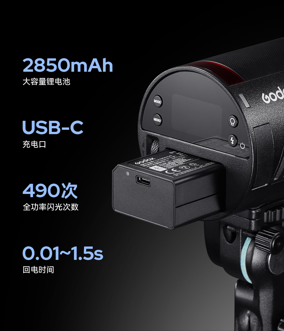 AD100Pro II标配电池拥有2850mAh,全功率闪光次数提升至约490次,并带有USB-C接口,充电方便快捷,告别电量焦虑