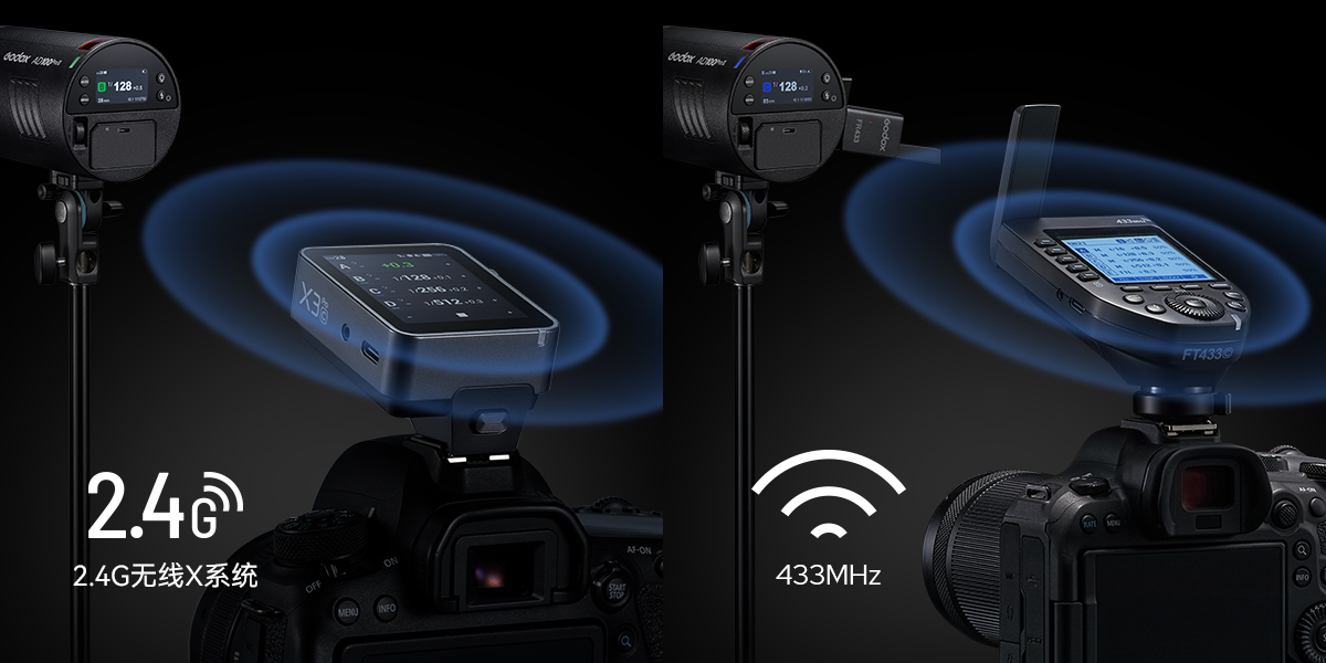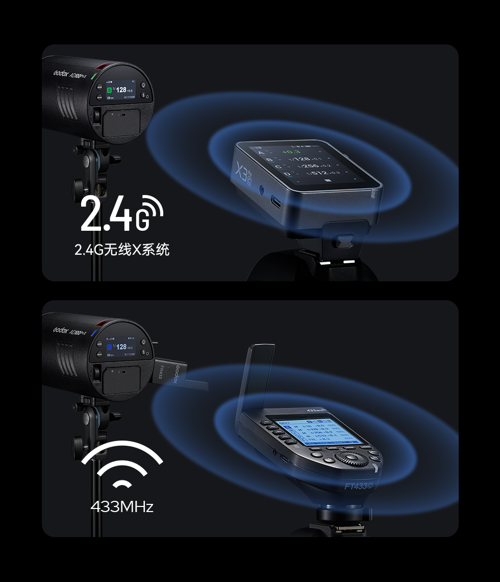 AD100Pro II搭载神牛无线X系统,可兼容神牛2.4G全系列无线引闪器,带来稳定、便捷的布光体验;同时可通过AD100Pro II机身USB-C接口连接FT433接收器(需另购),实现433MHz信号控制,满足不同摄影师的引闪需求!