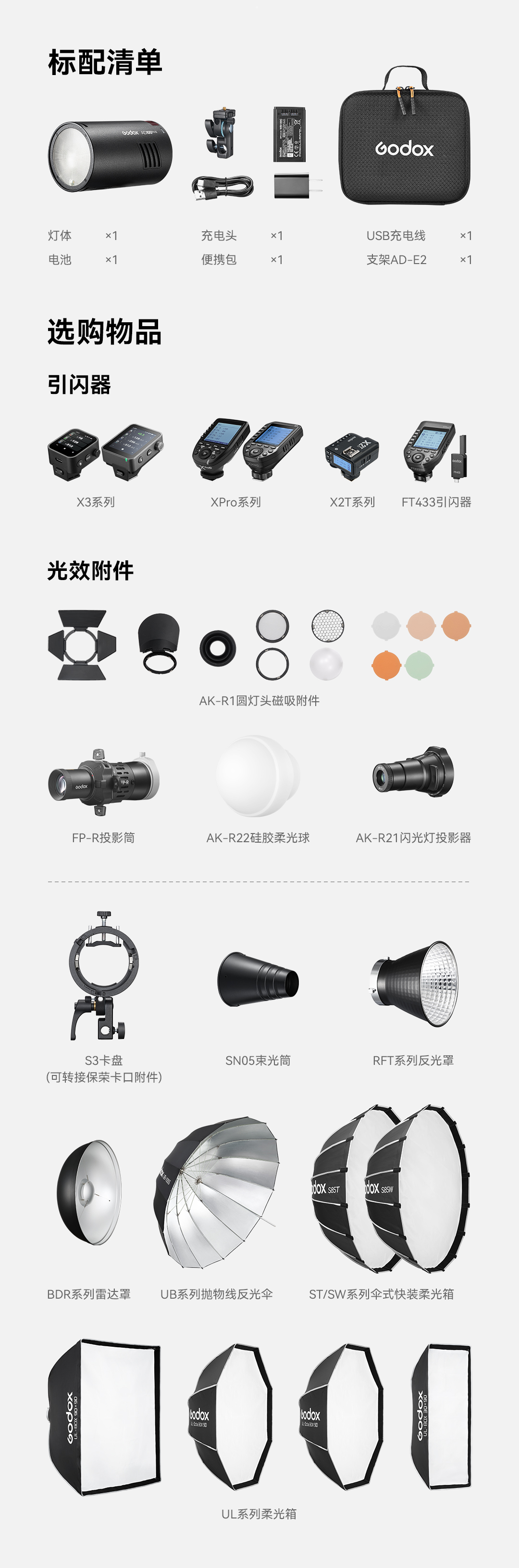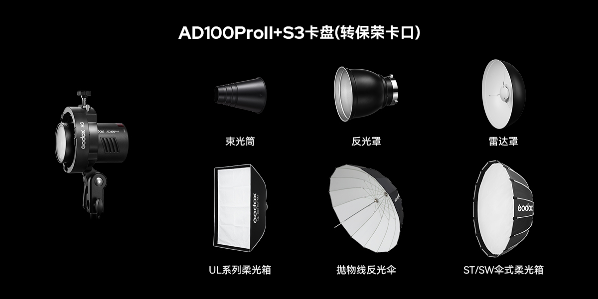 AD100Pro II拥有丰富附件生态,灯头内置磁吸片,可搭配AK-R1磁吸套装,便捷控光;搭配全新FP-R投影筒,轻松实现多样创意光效;此外还可通过S3卡盘转接保荣卡口附件,无缝兼容UL柔光箱、BDR雷达罩等多种附件。