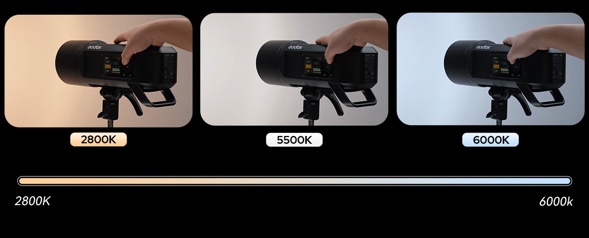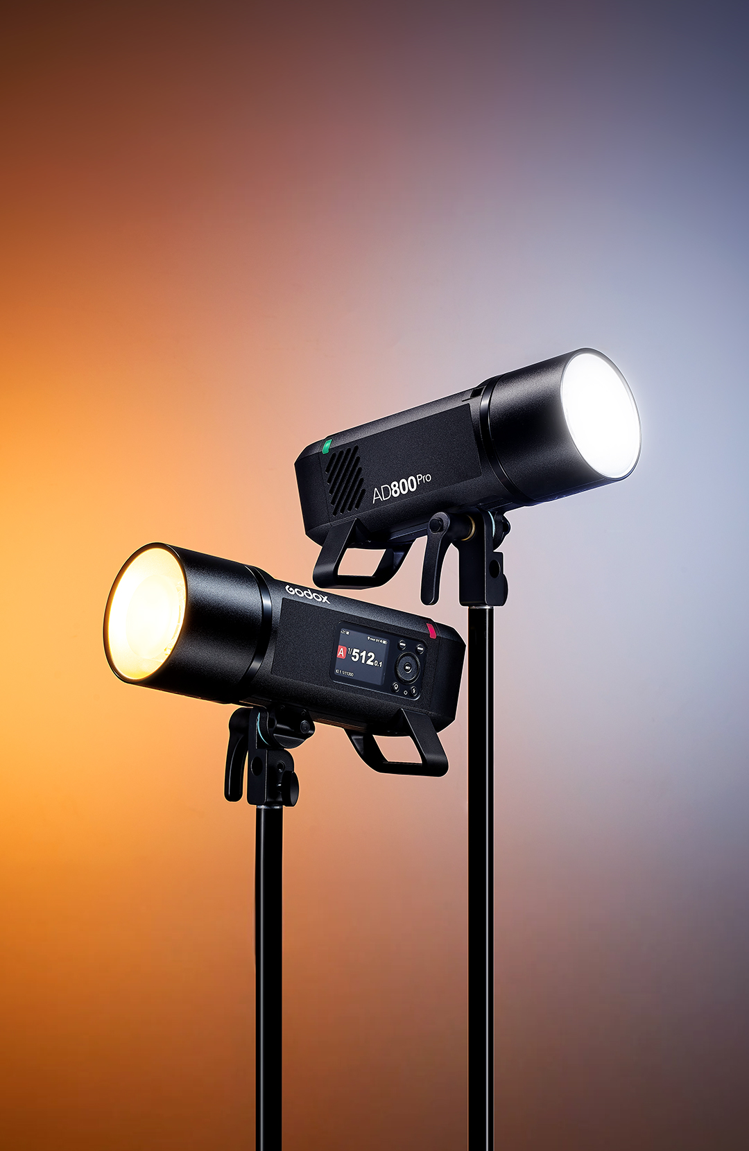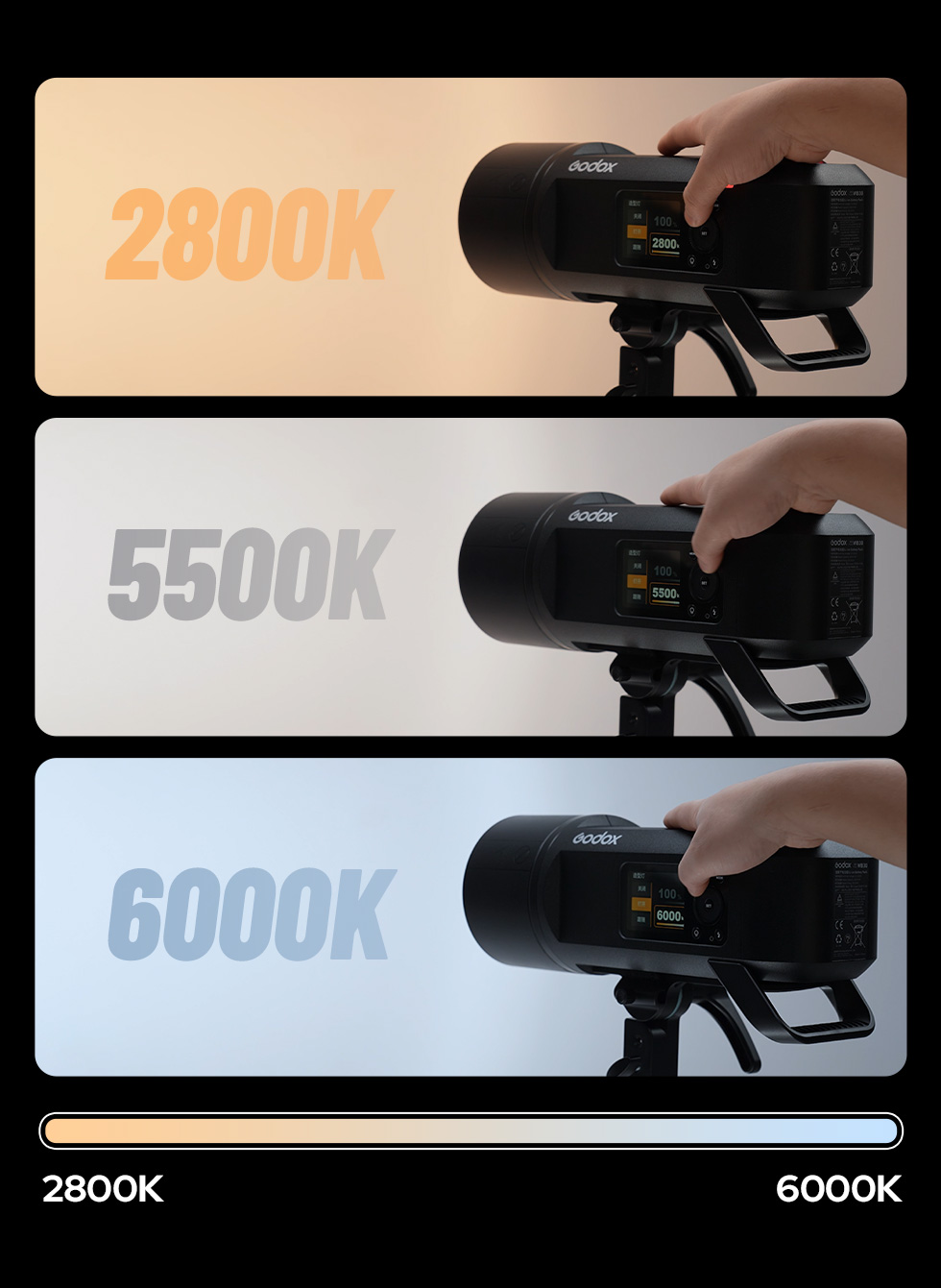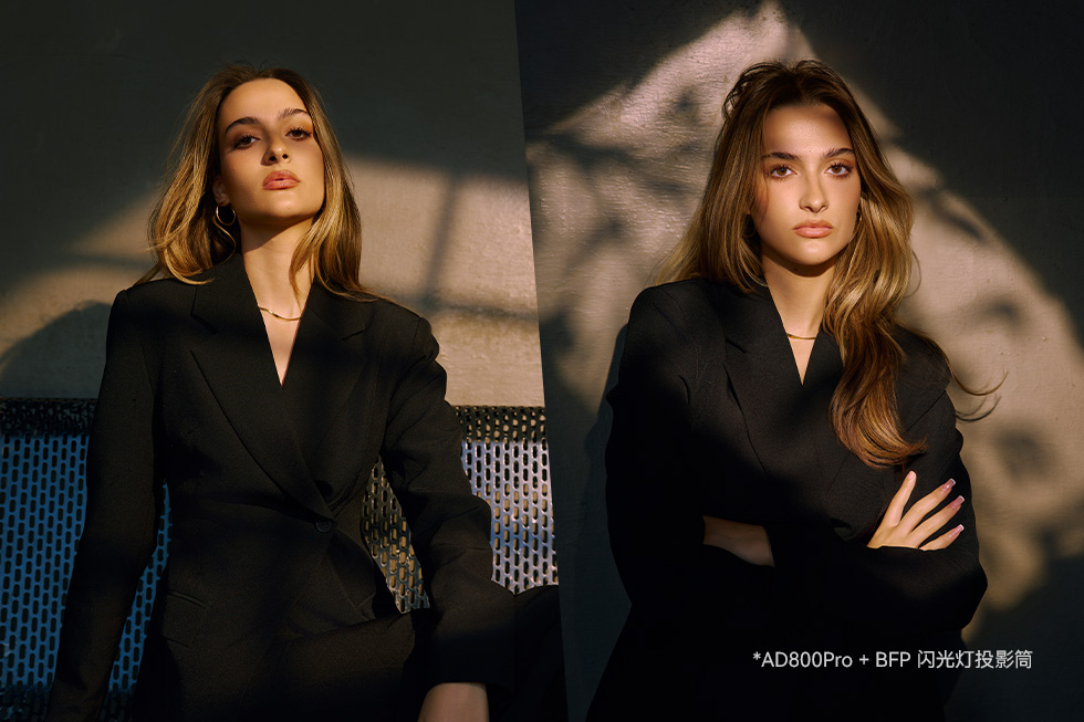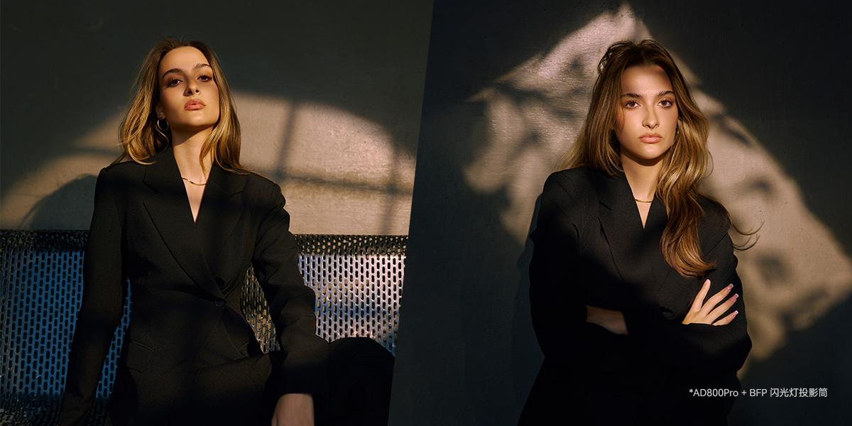 AD800Pro内置40W双色温造型灯,支持2800K~6000K色温调节,10~100%亮度范围,便于预览光影效果、便捷对焦;造型灯同时拥有CRI≈97/TLCI≈98的超高显色指数,可满足视频拍摄需求。