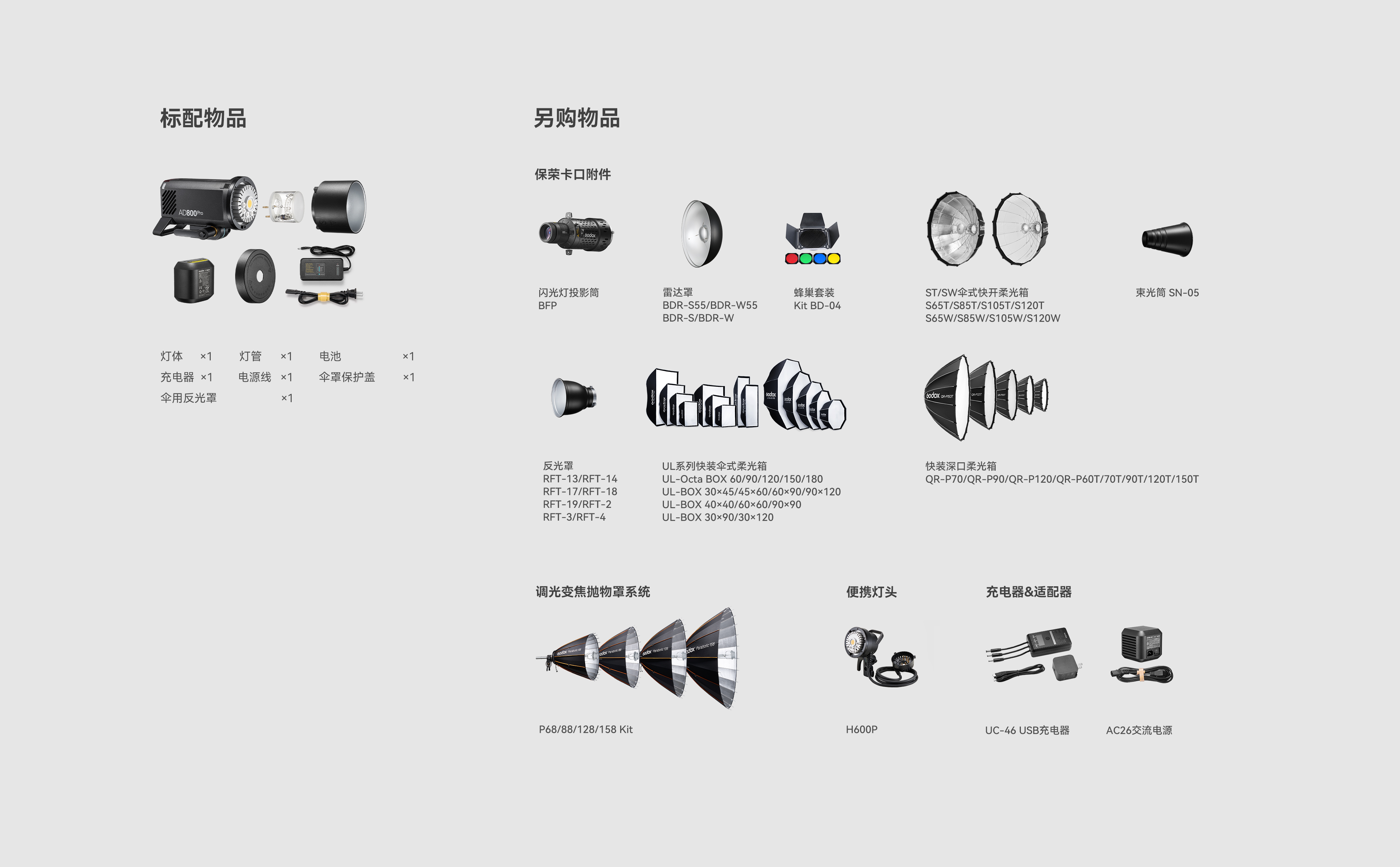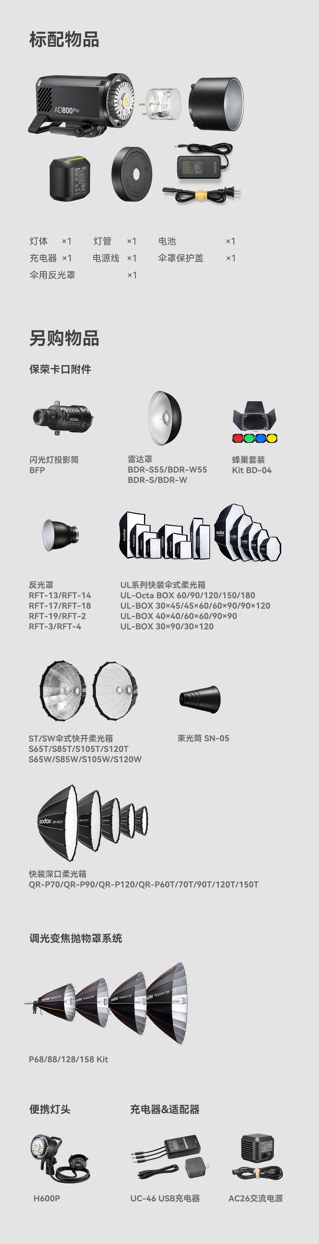 ·AD800Pro采用保荣卡口设计,可适配UL系列柔光箱、BDR雷达罩、BFP投影同等海量专业光效附件,满足各种进阶布光需求。