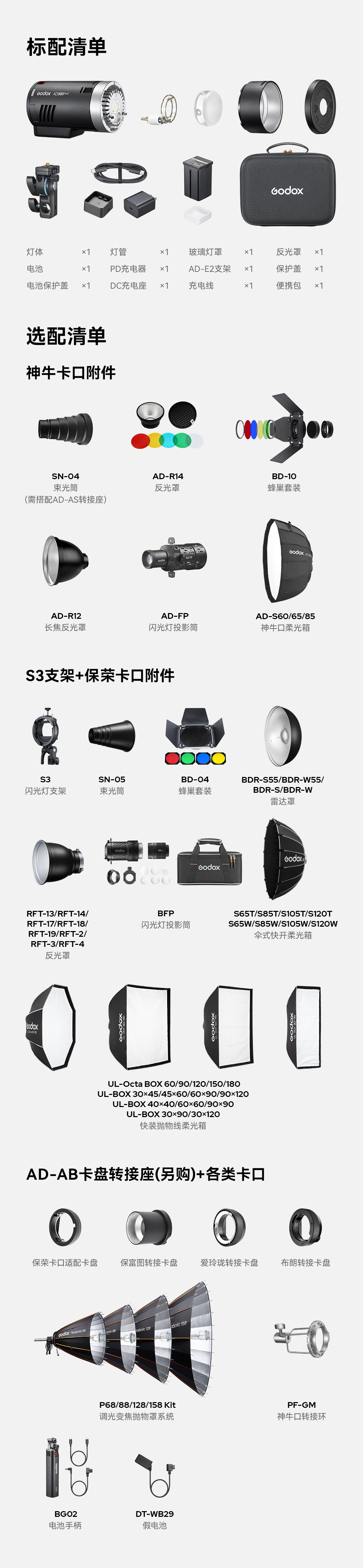 神牛卡口设计,兼容多种神牛口控光附件。另购S3闪光灯支架,兼容保荣卡口附件。也可选配AD-AB转接环,兼容布朗、保富图、爱玲珑等卡口附件,自由拓展专业光效。