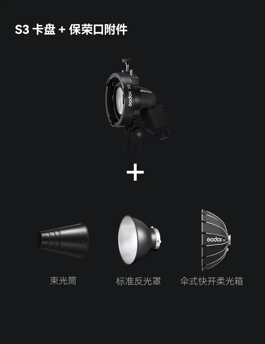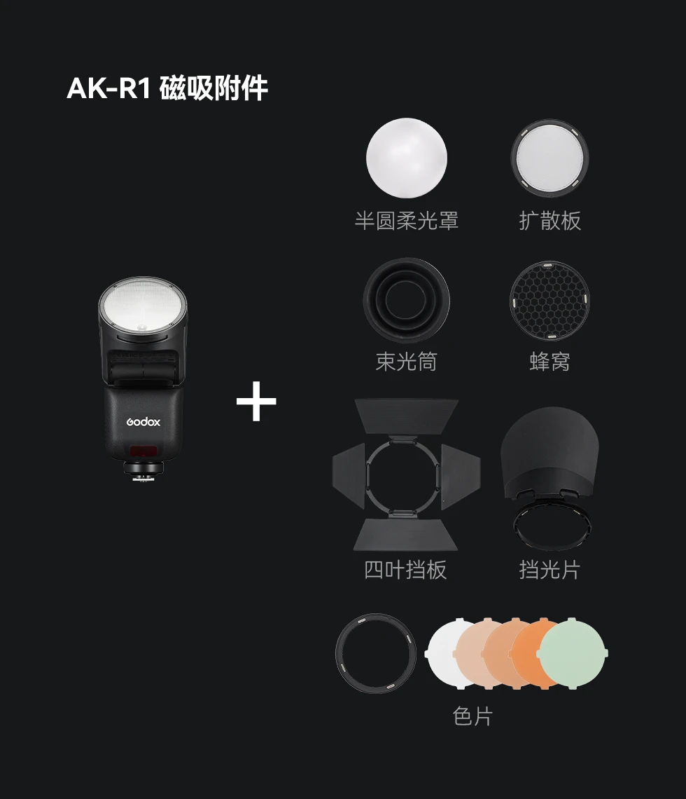 V1mid拥有丰富的附件生态,灯头配有磁吸片,可搭配AK-R1圆灯头磁吸附件快速实现控光操作。通过S3卡盘转接保荣卡口附件,拓展多款保荣卡口附件,解锁更多布光可能。