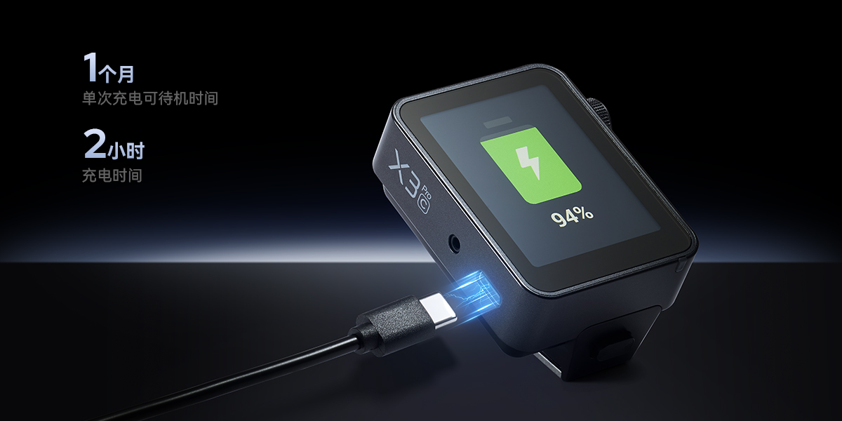 X3Pro内置高效锂电池,单次充电可待机约1个月;并支持USB-C通用接口,仅需2小时即可完成充电,轻松匹配高强度拍摄任务。