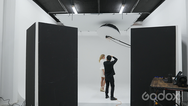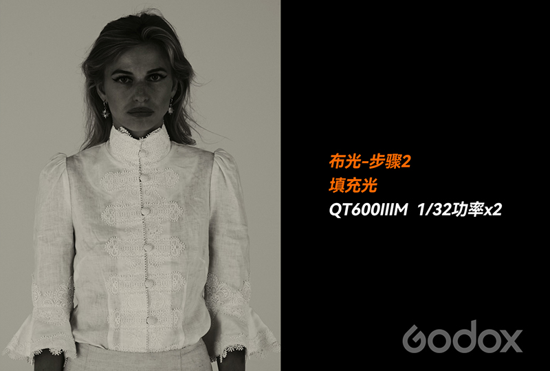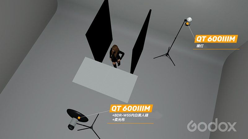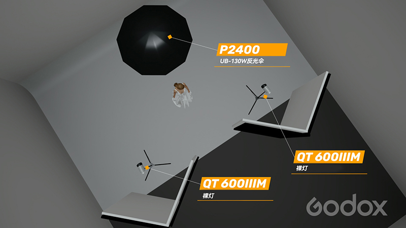 然后,在两侧各加一盏QT600IIIM,同时把反光板摆成类似书本打开的造型,灯打在反光板上,让对称的柔光反射到模特身上。