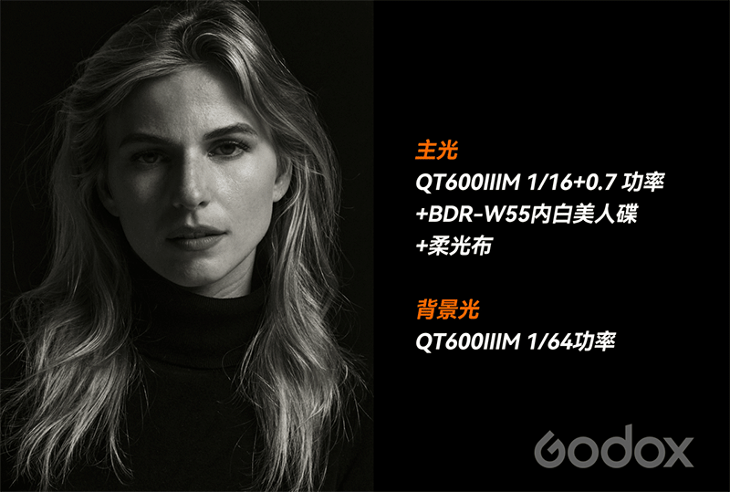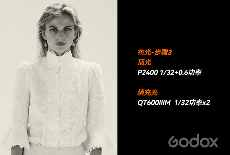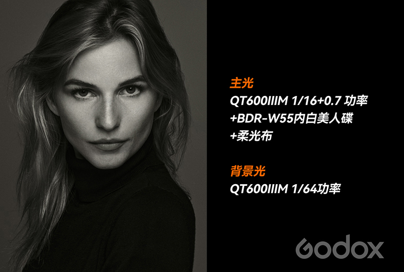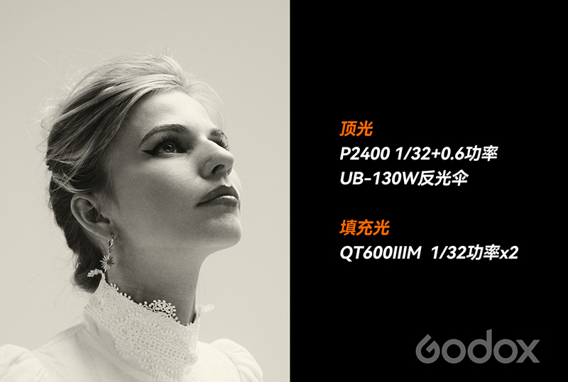 我将一盏QT600IIIM作为主光,搭配专业内白美人碟,装在前方正中央的大型顶灯架上,并用柔光布来柔化光线。