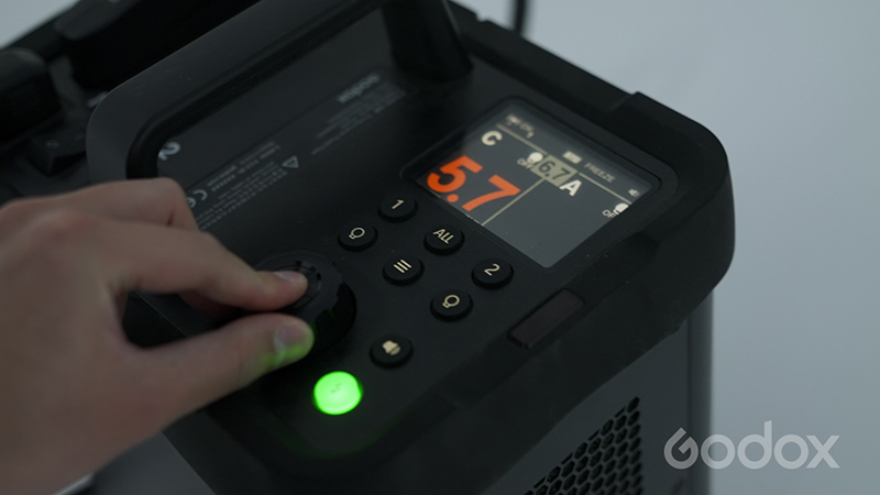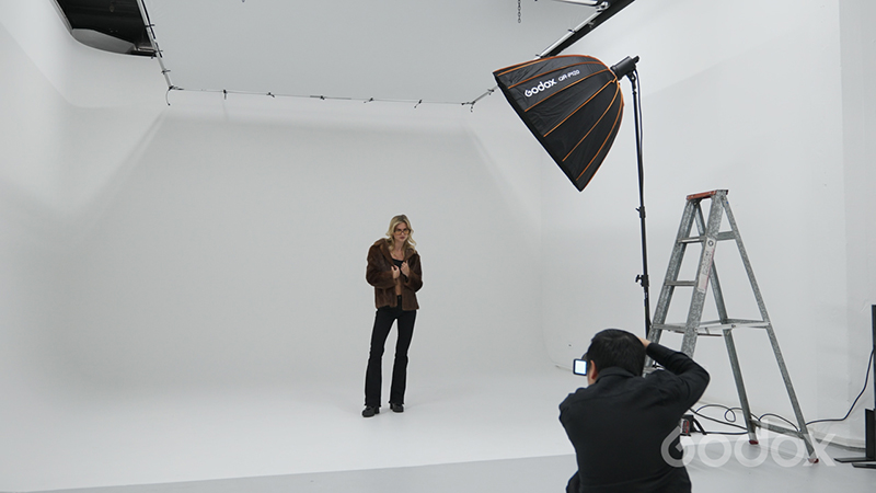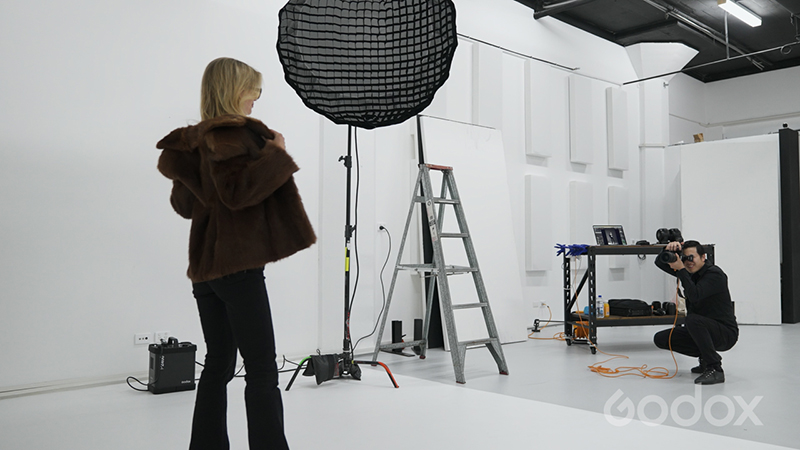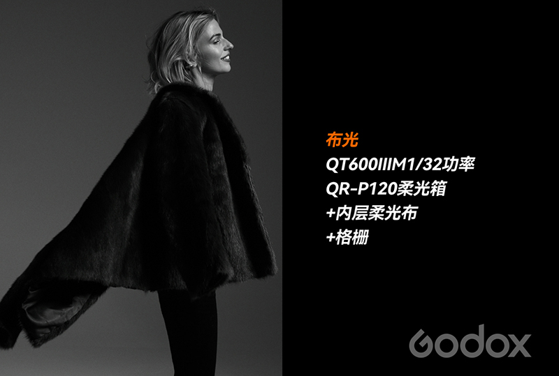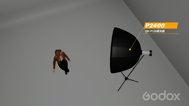把灯放在模特左侧45度上方的位置,用快装抛物线柔光箱QR-P120,搭配P2400电箱和H2400P灯头,输出功率更大、回电更快。