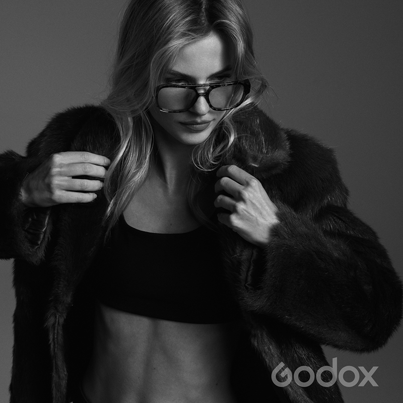 为了进一步塑造光线效果,我在模特两侧各放置了一块黑色反光板,以增加对比度和立体感,同时在模特前方放了一块白色反光板,稍微反射一些光线。