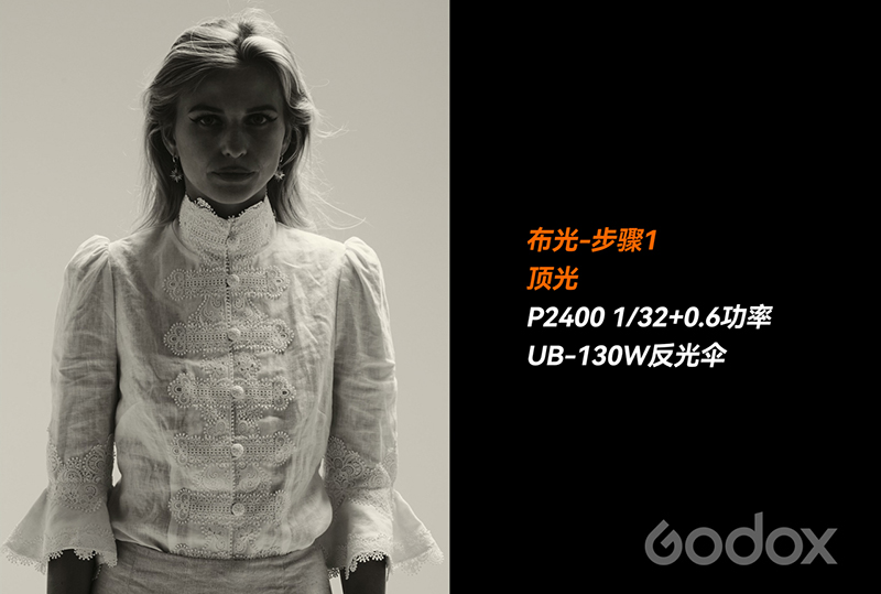 这一组我用了3盏灯。第一盏是H2400P灯头,连接P2400电箱,通过顶灯架作为顶光照亮发丝,营造更复古梦幻的质感。