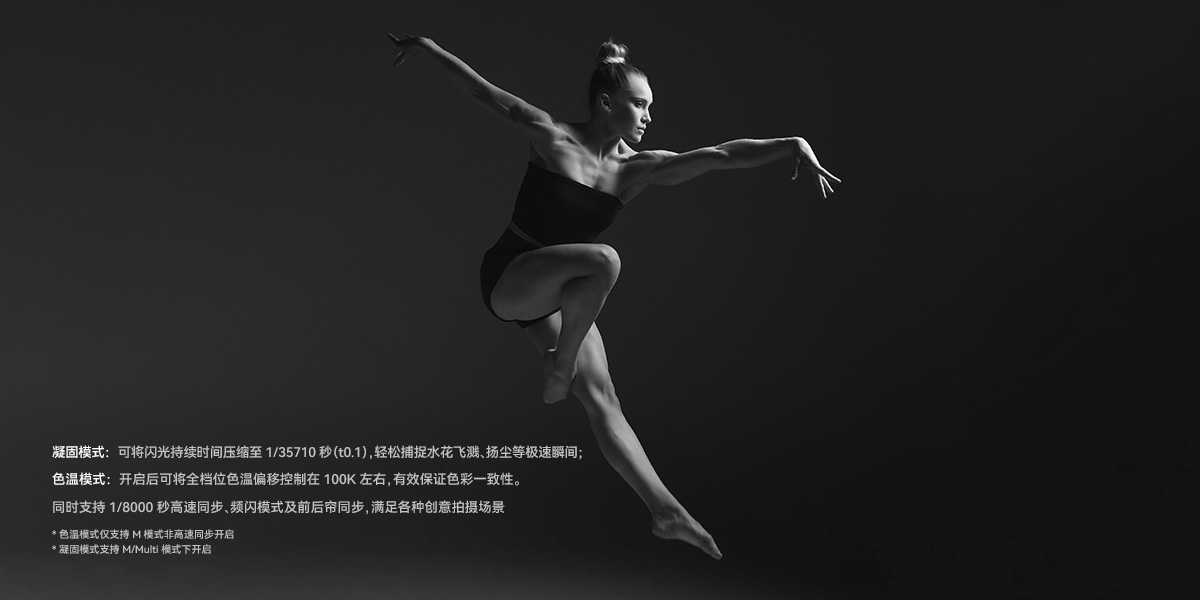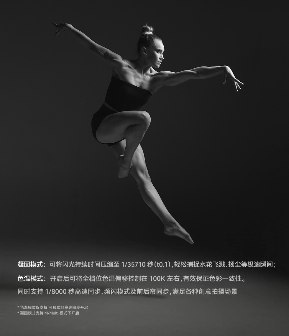 AD800Pro搭载色温、凝固两种进阶模式:凝固模式下可将闪光持续时间压缩至1/35710秒(t0.1),轻松捕捉水花飞溅、扬尘等极速瞬间;色温模式则有效解决色温偏移问题,开启后可将全档位色温偏移控制在100K左右,有效保证色彩一致性。