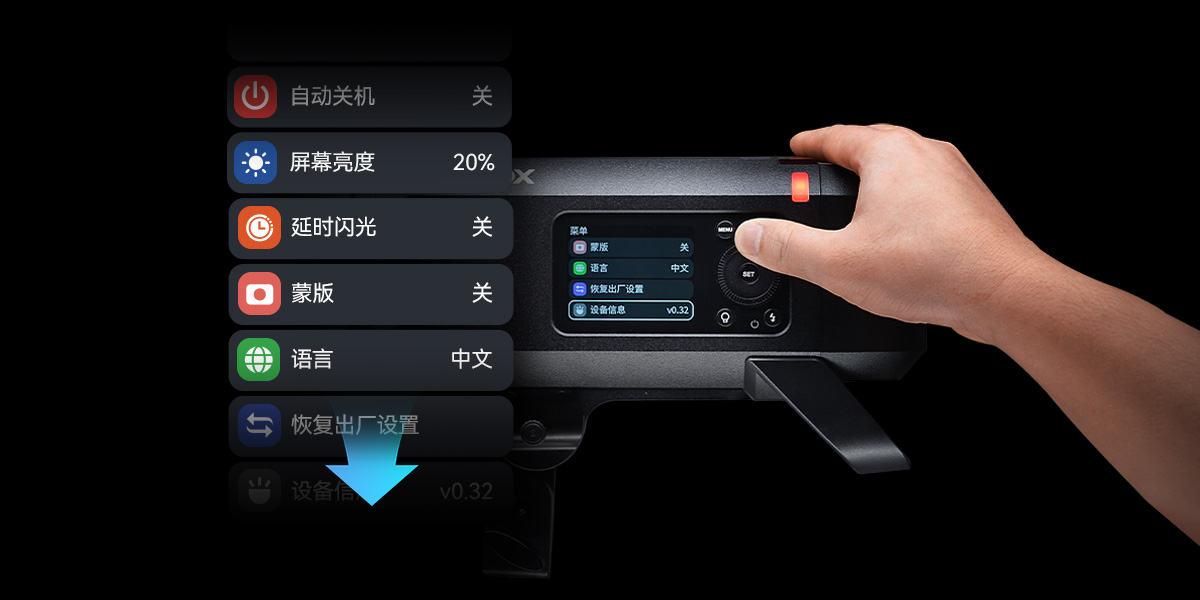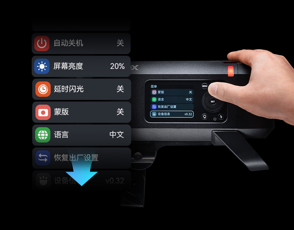 AD800Pro搭载全彩屏幕,搭配直观中文菜单、科学合理的按键布局及人性化交互逻辑,在快节奏的拍摄流程中可快速调节参数,选择功能,提升效率。