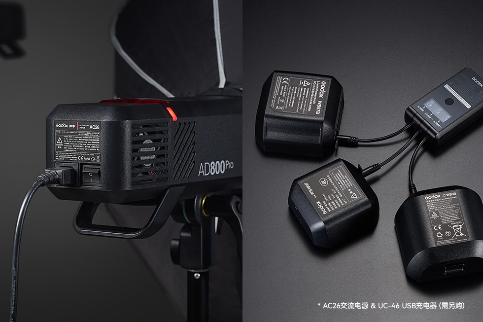 多种供电方式:AD800Pro支持多种充电方式,可使用AC26交流电源直插供电;可搭配 UC46 充电器实现 1.5小时极速满电,同时可兼容AD600ProII 系列电池。