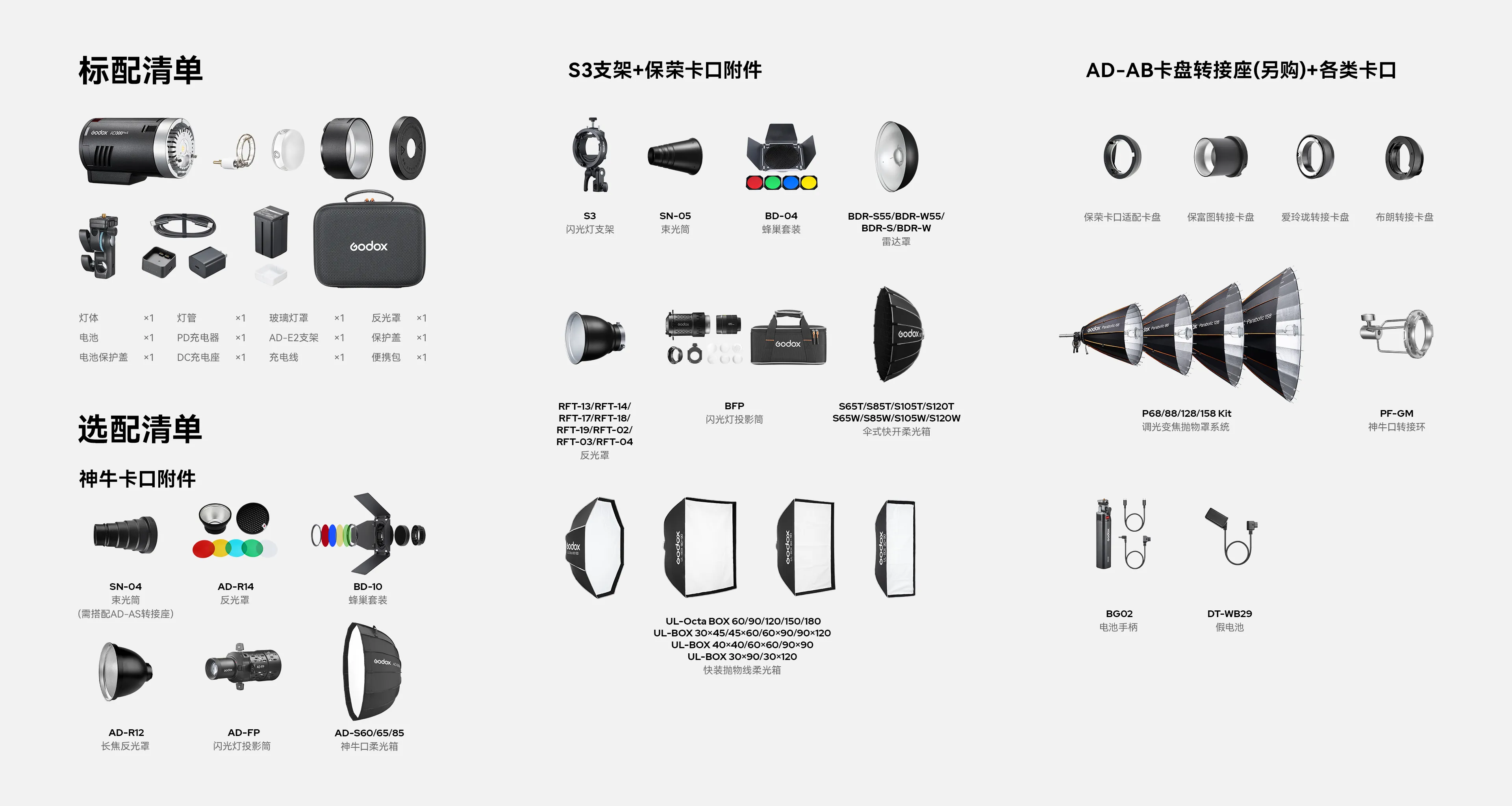 神牛卡口设计,兼容多种神牛口控光附件。另购S3闪光灯支架,兼容保荣卡口附件。也可选配AD-AB转接环,兼容布朗、保富图、爱玲珑等卡口附件,自由拓展专业光效。
