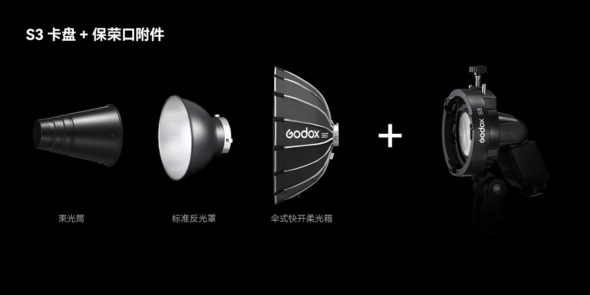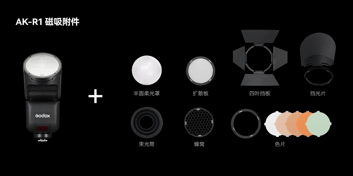 V1mid拥有丰富的附件生态,灯头配有磁吸片,可搭配AK-R1圆灯头磁吸附件快速实现控光操作。通过S3卡盘转接保荣卡口附件,拓展多款保荣卡口附件,解锁更多布光可能。