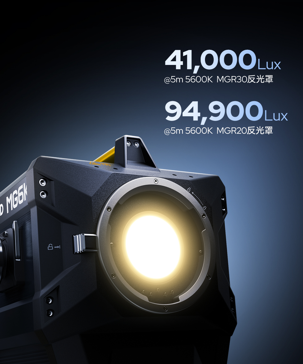 得益于MG6K强悍的亮度输出以及精密的光学设计,搭配MGR15反光罩,可大幅提升光学效率,减少光损,带来超强的光线穿透力,照度达到6K Par灯窄角角度照度,适配远距离布光场景。