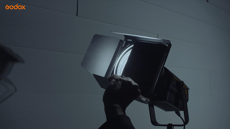 接下来,我拿了一台带四页板的 VL200 ,功率调到了22%。调整四页板塑造一束范围较小的光,然后添加一张色片来创造暖色路灯的效果,在镜头里与远处后墙的光契合。