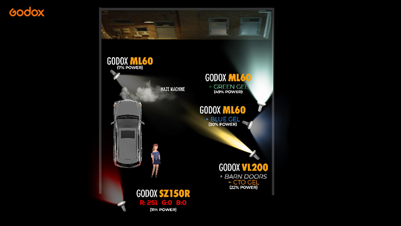 现在,我需要让汽车看起来坏掉了,所以我使用烟雾机来制造烟雾效果。我把另一台 ML60 放在车旁的地上,让烟雾在镜头里看得更清楚。