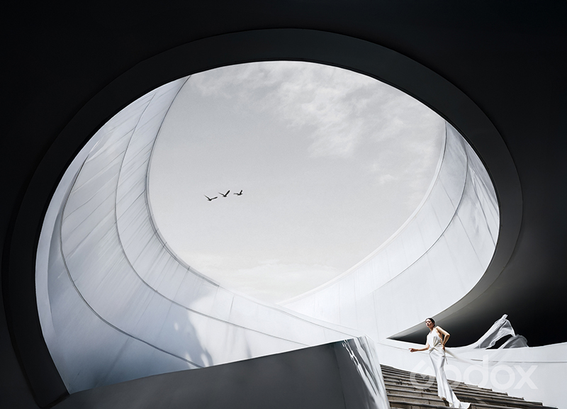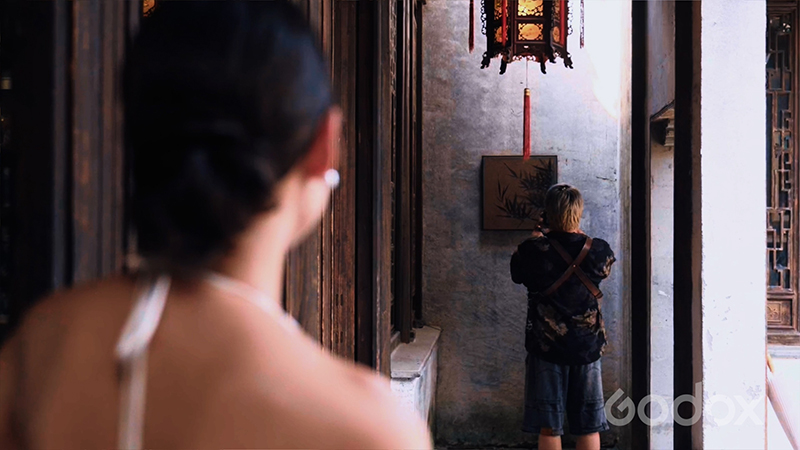 这个天井非常漂亮,我想把人物框在里面。但是在这个环境下,人物一定是大背光,呈现非常强烈的逆光效果。