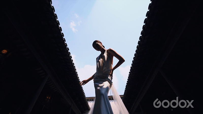 这整面墙都在阴影里面,我们让模特也在阴影里,形成一个柔光环境。